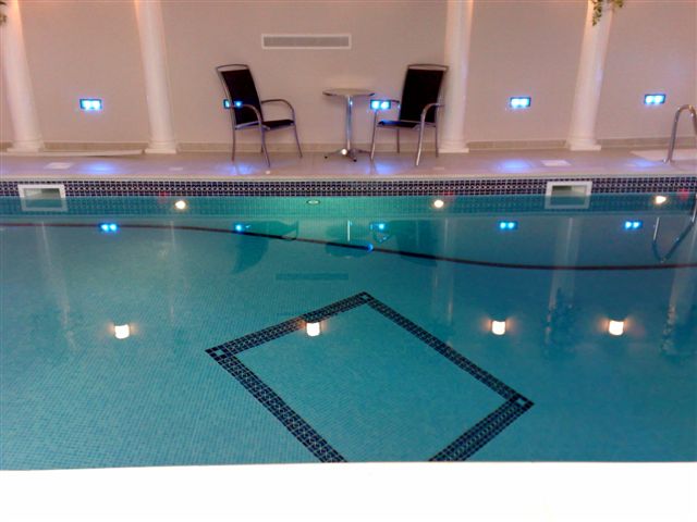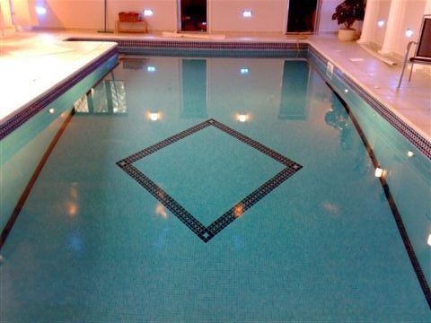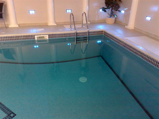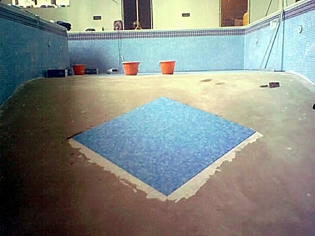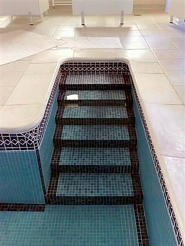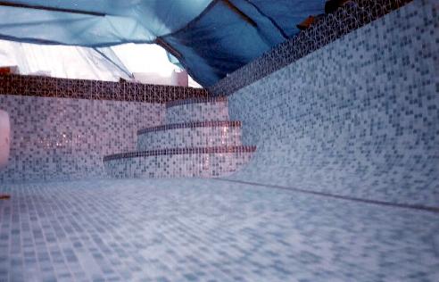 This was a pool refurbishment that we did in conjunction with 'The Pool & Spa People'. This was a Marbelite clad open air pool with a simple mosaic band at the waterline. The integrity of the structure was extremely sound and it had worn very well but looked a bit tired so the owner decided to have it tiled in mosaic. The transformation speaks for itself and although the photos are not great, you can see the before and after look of the thing. The steps were pretty skew wiff and we had to do a lot of prep work on them to get them right.