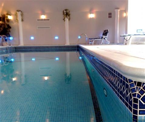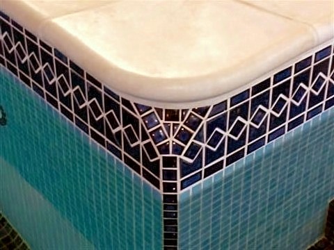 Our solution to a square corner with a round capping stone. You can't have any square vertical corners in a pool, far too dangerous. The vertical course of dark blue mosaic at an angle highlights the corner and makes it safer.