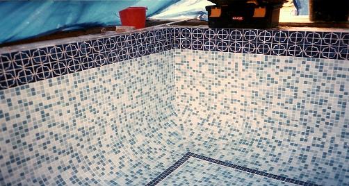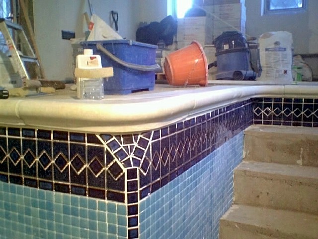 This was a brand new pool construction with two basic problems. When we arrived, we found that someone had laid the capping stones 1" out of level (which when the pool was full of water would stand out like a sore thumb) and the plasterers had screeded the pool 'slab' off of the back of the stones so that was 1" out of level too. We had to remove all the capping stones then clean and refix them once all the mosaic was completed. This is the proper sequence for tiling a pool, and ensures that the crucial eyeline where water meets mosaic line is perfect.