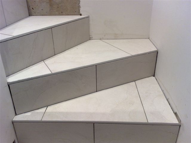 Although there seems little wrong with the step tiling, we would have preferred to fix a darker non slip nosing tile set within the base tile, as a strip across the treads. This would make it clear there was a step and introduce a non slip edge to each tread.