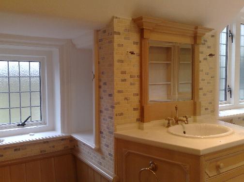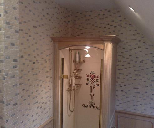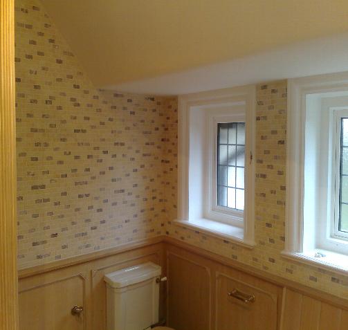 This bathroom had the top half tiled using a brickjoint marble mosaic, the bottom had existing oak panelling on it and was not touched