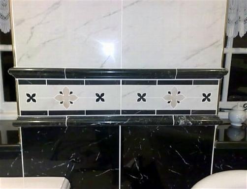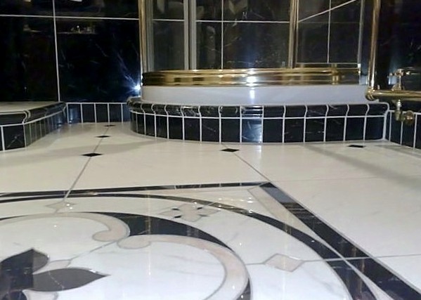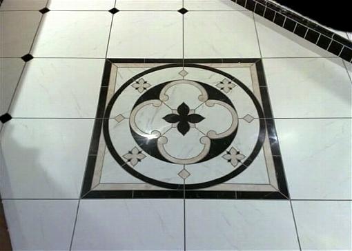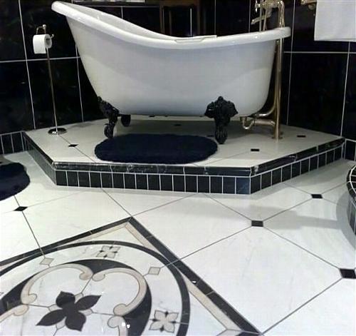 An enormous amount of cutting on this job. The border was composed of two black marble dado rails with a waterjet cut centre in pink white and black porcelain
