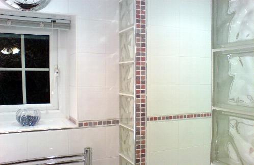 The mosaic and chrome edge fixed to the end of the of the glass blocks looks spot on too.