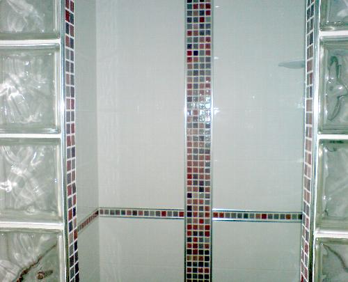 Here we see a very small ensuite showeroom that has been made far more interesting with a few courses of mosaic and a few glass blocks to help hide the shower curtain drapes. Looks stunning, yet this cost very little to put together, 8" bumpy white and a few sheets of mosaic, some trim and a bit of imagination,
