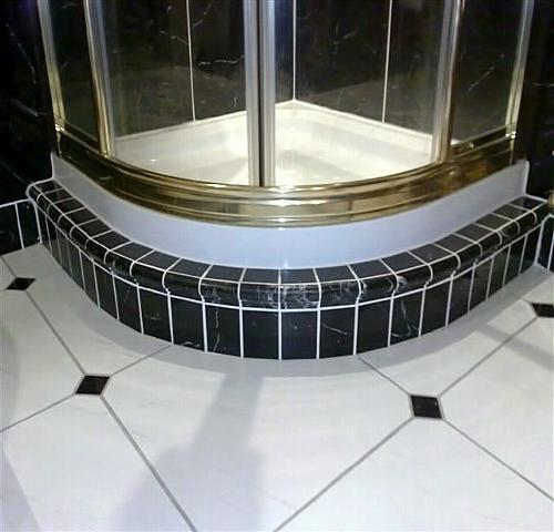 Again, there was no room between the joists for pipework so we created this feature to the shower base plinth by cutting up the black marble dado and the black base tile.