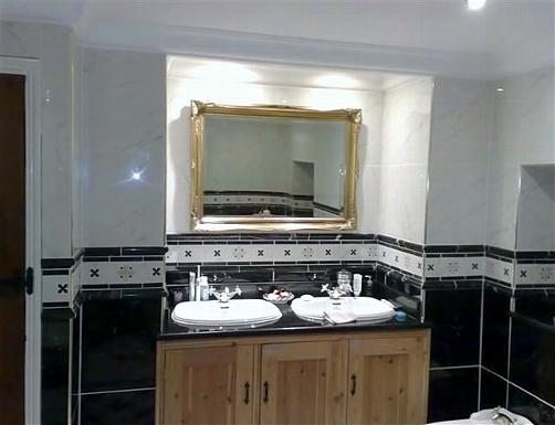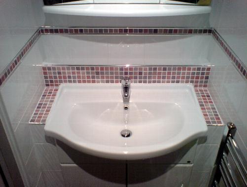 By adding Mosaic and chrome trim to the theme you can finish awkward bits like the vanity area surround and it still looks good. The little shelf above the sink is hygienic, useful, looks good and costs nothing except a little thought.